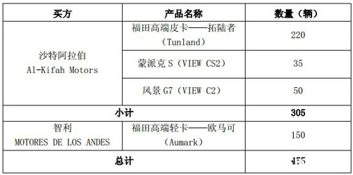 近日,北汽福田汽车股份有限公司与沙特阿拉伯 Al-Kifah Motors签订了220辆福田高端皮卡——拓陆者(Tunland)、35辆蒙派克S和50辆风景G7的销售合同,与智利 MOTORES DE LOS ANDES签订了150辆福田高端轻卡——欧马可的销售合同。