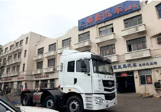 在重卡使用集中的天津港,载着集装箱的各品牌港口牵引车在路上来来往往,一派繁忙的景象。在紧邻天津港的一处门店前,摆放着一辆白色的华菱汉马H6 牵引车,华菱星马天津总经销商——天津港泰龙汽车销售服务有限公司就坐落于此。
