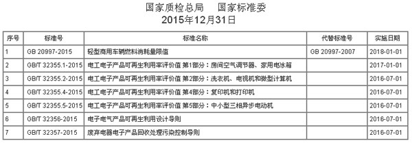 | 1 | GB 20997-2015 | 轻型商用车辆燃料消耗量限值 | GB20997-2007 | 2018-01-01 |