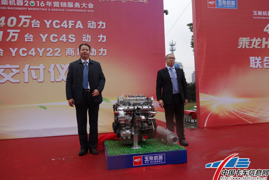 海格客车副总经理邱远红和广西玉柴机器股份有限公司总裁吴其伟为第40万台YC4FA揭幕