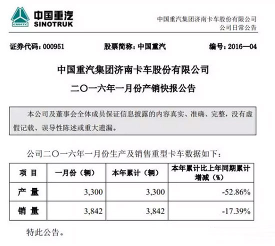 证券代码:000951 股票简称:中国重汽 编号:2016—04