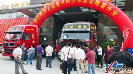4月16日,大运重卡广州大运分公司于广州南沙港隆重开业,现场订车多达近70台。