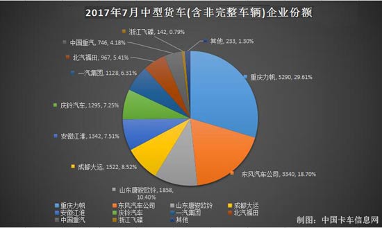 本月,东风、一汽继续遭遇下滑。销量前十企业共计销车17630辆,占据7月份整个中型货车(含非完整车辆、半挂牵引车)市场总销量98.70%的份额,仅排行榜前两名就占据近半壁江山。山东唐骏欧铃以1858辆的销量挺进前三,同比累计增幅高达190.42%,为前十企业中最高。