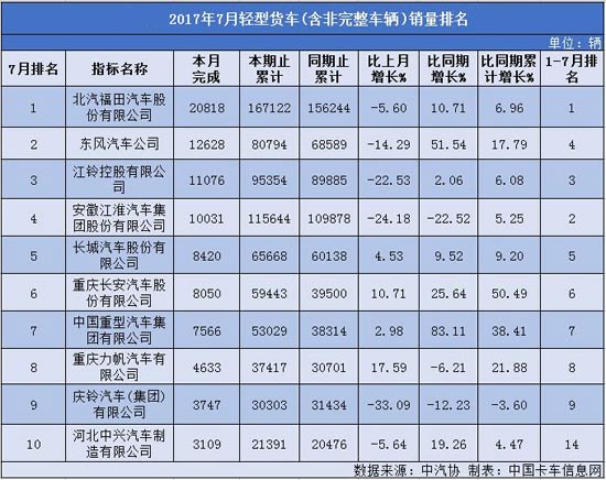 轻卡:福田冠军宝座无人撼动 重汽、东风增幅高