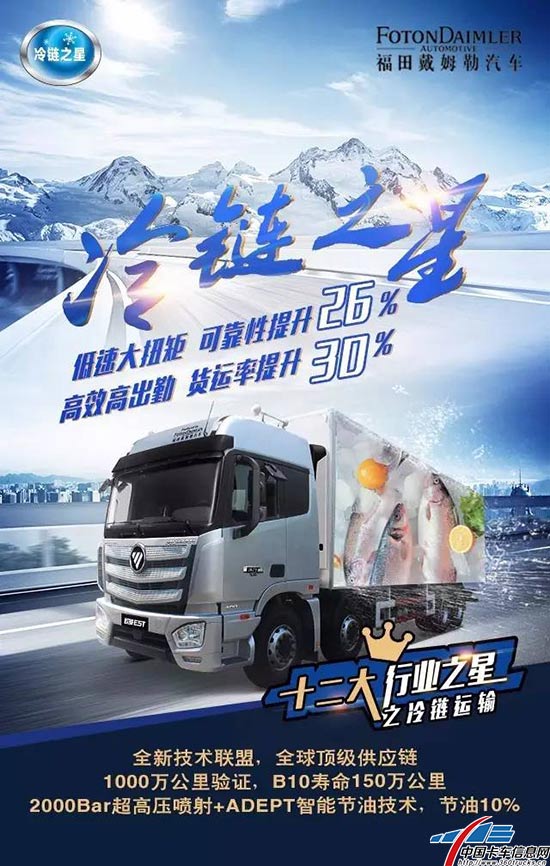 欧曼打造的冷链之星——欧曼EST超级卡车:由福田戴姆勒汽车携手超级卡车全球创新联盟成员打造,历经1000万公里道路验证,B10寿命150万公里,智能节油技术,节油10%,可靠性提升26%,货运效率提升30%。