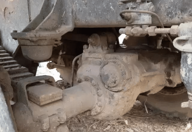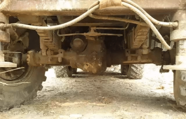 从这张图中我们可以看到右边连接分动箱的差速器和车桥中间的主减速器,其与当代越野卡车不同的地方在于如今大多数卡车都使用了门式车桥而是采用了老式的断开式车桥,虽说老式的断开式车桥提高了车辆的越野能力在通过性方面还是欠缺,但门式车桥毕竟是比较先进的技术,在那个年代只得使用传统技术。左侧的限位器下方和减震机构有明显接触的痕迹。