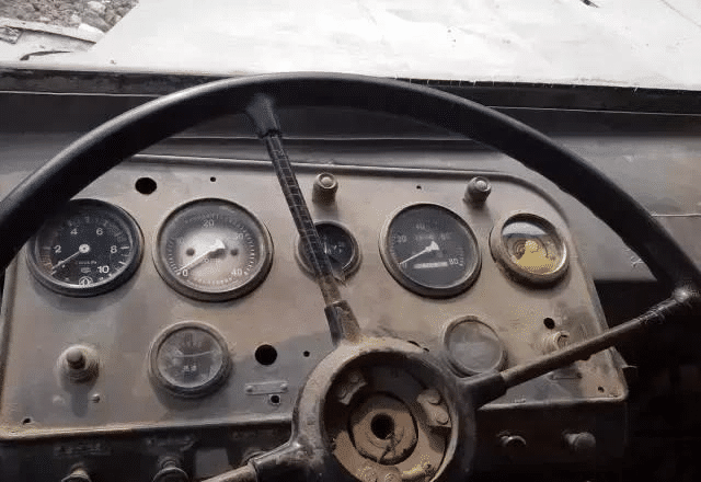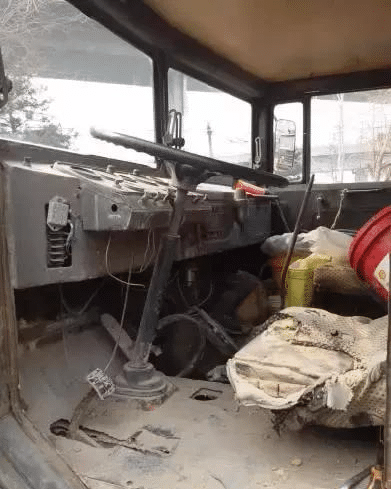 全金属制方向盘摸上去非常有手感,但由于掉漆等问题方向盘大部分已经生锈,后来包裹的橡胶胶带也相继脱落。全金属工作台体现出了军用卡车的特性,在每个按键的上方都标注有用处,这种简单不复杂的设计使得任何一名驾驶员都可以快速懂得每一个按钮和仪器分别代表了什么。最左边的气压表由于损坏已更换成东风生产的气压表来替代,其他仪表均可以正常使用。方向盘正中的喇叭按钮也不翼而飞,只剩下裸露在外面的电线。