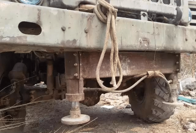 由于后方安装的是钻井上装,在挖掘的同时需要固定车身,所以在保险杠的下方安装了液压支撑腿,因使用时间久远外表已经锈迹斑斑。