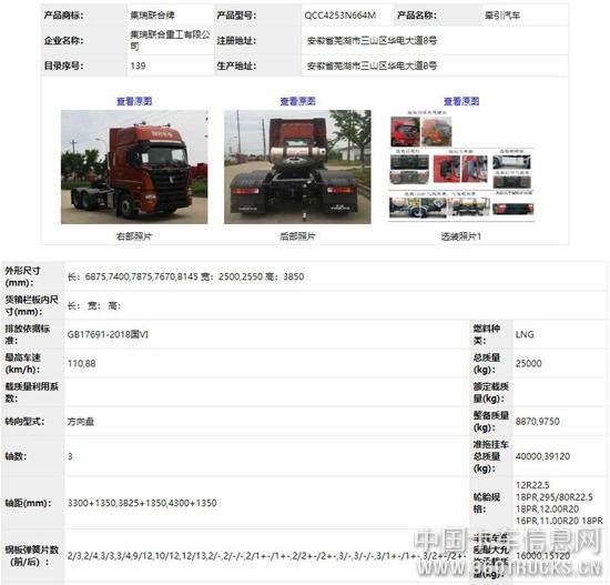 联合卡车此次申报的天然气牵引车,产品型号为QCC4253N664M。整备质量最低为8.87吨。有YCK11400N-60和YCK11380N-60,两种动力可供选择。排量10980ml,最大功率最大为294kw,最大输出动力为400马力。具体配置详见下表: