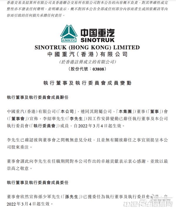 3月4日,中国重汽(03808)发布公告称,李绍华因工作安排变动已辞任执行董事及公司执行委员会成员,自2022年3月4日起生效。孙少军已获委任为执行董事及执行委员会成员,自2022年3月4日起生效。