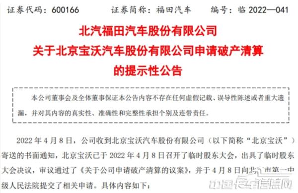其实,去年就有宝沃破产的传言,福田汽车陆续发布的公告更是步步“实锤”。
