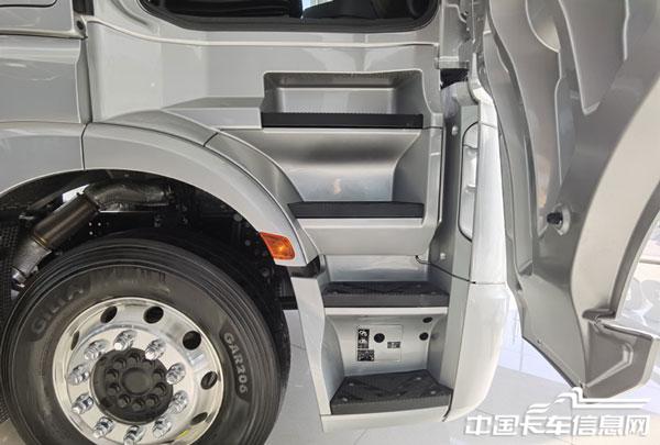 实拍这款国产奔驰Actros采用双油箱设计(双腔加热功能),总容积可达990L,可保证优秀的续航能力,在快递、快运、冷链等高时效性运输场景当中,可以节省车辆进站加油时间,更符合中国运输市场的需求。