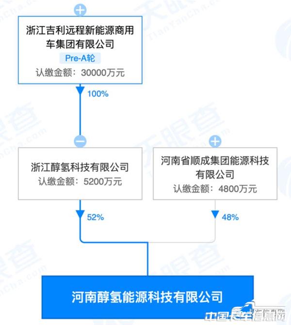 天眼查App显示,近日,河南醇氢能源科技有限公司成立,法定代表人为刘汉如,注册资本1亿人民币,经营范围含储能技术服务;新兴能源技术研发;新材料技术研发;气体、液体分离及纯净设备销售;汽车销售;站用加氢及储氢设施销售;二手车经纪等。股东信息显示,该公司由浙江吉利远程新能源商用车集团有限公司旗下浙江醇氢科技有限公司、河南省顺成集团能源科技有限公司分别持股52%、48%。