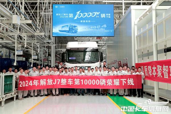 2024年5月28日中午11时30分,一汽解放J7智能工厂迎来了具有里程碑意义的时刻——2024年第10000辆整车正式下线,较2023年提前5个月突破万辆。