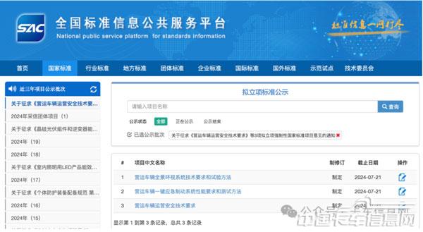 近日,国家市场监督管理总局标准技术管理司发布消息,决定对《营运车辆全景环视系统要求和检验方法》《营运车辆一键应急制动系统性能要求和测试方法》《营运车辆运营安全技术要求》3项拟立项强制性国家标准项目公开征求意见,征求意见截止时间为2024年7月21日。