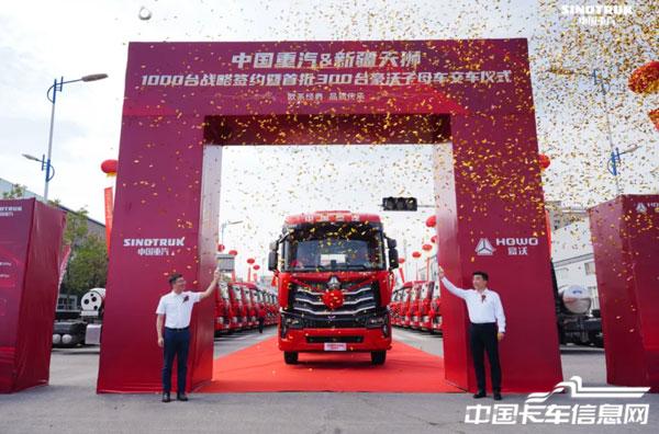 在天山脚下的新疆乌鲁木齐,一场盛大的交车庆典隆重举行,标志着中国重汽豪沃重卡与新疆天狮供应链管理有限公司合作的新篇章正式开启。8月25日,我们不仅见证了300台精心打造的豪沃子母车荣耀交付,更迎来了双方1000辆战略合作签约的历史性时刻,共同引领煤炭运输行业迈向新高度。