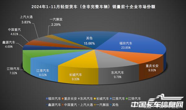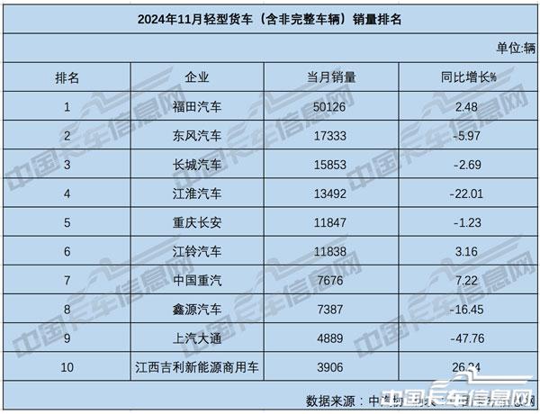 从同比增幅来看,11月份,轻卡市场前十企业中有四家企业实现增长,分别是福田、江铃、重汽和江西吉利新能源,其中江西吉利新能源增幅最高,同比增长26.24%。