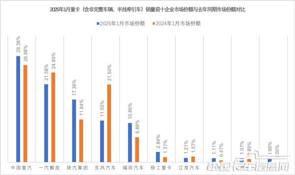 2025年1月份,重卡销量前十企业市场份额与去年同期市场份额相比,有重汽、陕汽、福田、徐工、汉马科技、北奔、奇瑞七家企业呈增长态势。