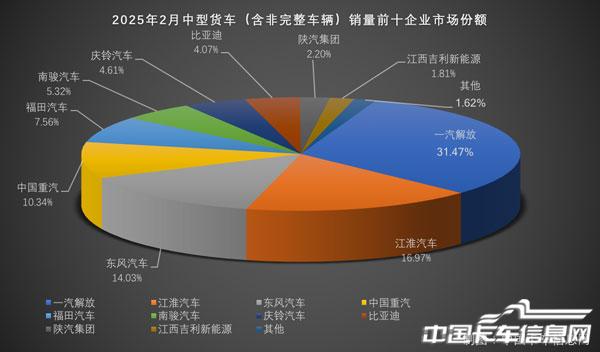 2025年1-2月份,中卡市场销量前十企业市场份额与去年同期市场份额相比,有解放、江淮、东风、庆铃、比亚迪、南骏、陕汽和吉利新能源八家企业呈增长态势。