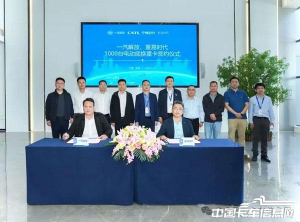 4月15日,一汽解放协同时代骐骥与重易时代(江西)新能源科技有限公司1000台换电重卡采购协议在江西宜春正式签署,相关方领导参加仪式。
